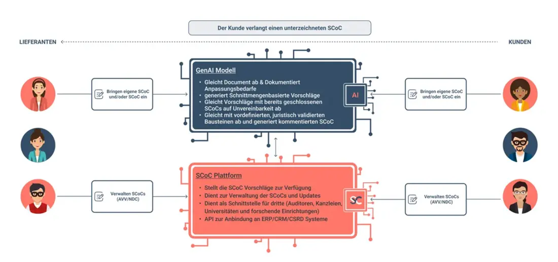 SMARTCHAIN brings together multiple digital tools powered by generative AI: from automated contract drafting and review to smart handling of complex regulatory demands. It helps standardize operations, ensure traceable compliance, and detect risks early on. Additional modules, such as ESG reporting and sanction checks, can be flexibly integrated, offering a scalable and practical solution for evolving business needs.