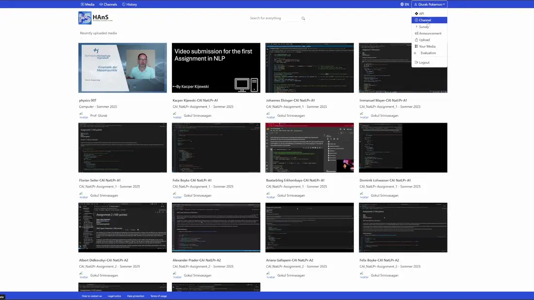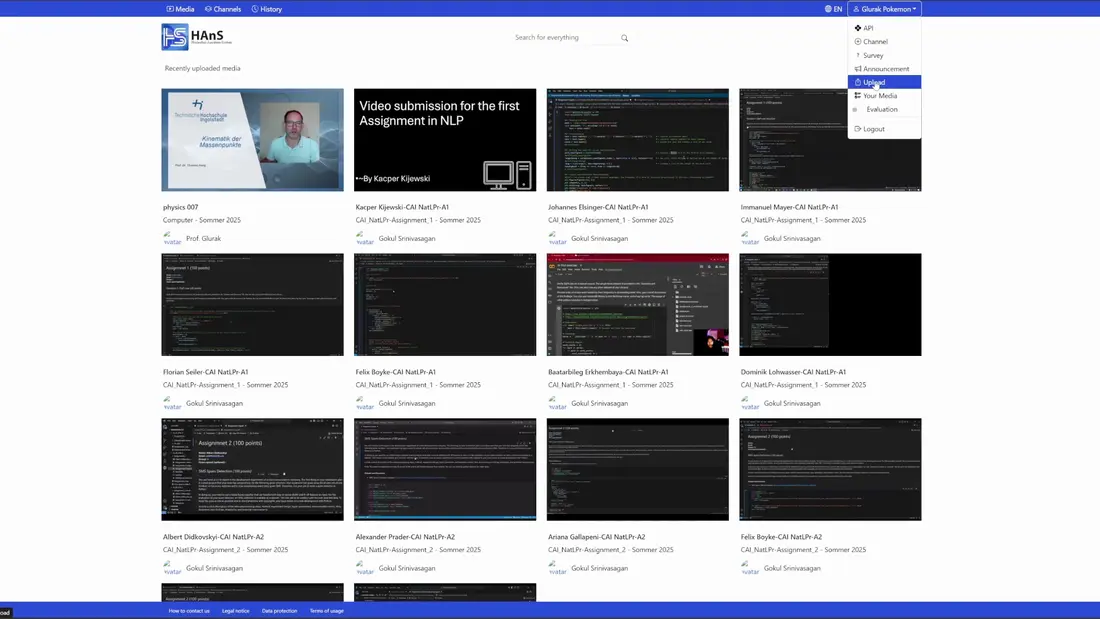 Wenn Sie die HAnS-Plattform öffnen, haben Sie über das Dropdown-Menü in der oberen rechten Ecke Zugriff auf die Hauptaktionen. Das Hochladen eines Videos ist eine der Optionen. Sobald Sie darauf klicken, werden Sie zur entsprechenden Oberfläche weitergeleitet.