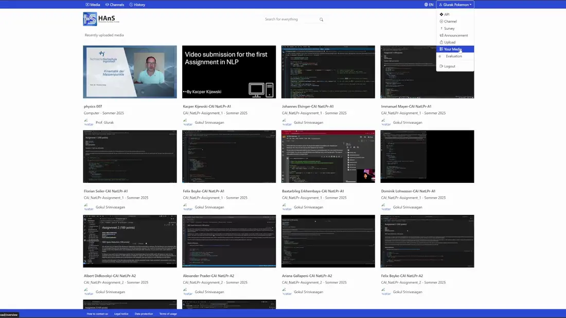 Sobald das System Ihr hochgeladenes Video und die Folien verarbeitet hat, sollten diese in Ihrer Liste der hochgeladenen Medien erscheinen. Diese finden Sie im Dropdown-Menü in der oberen rechten Ecke.